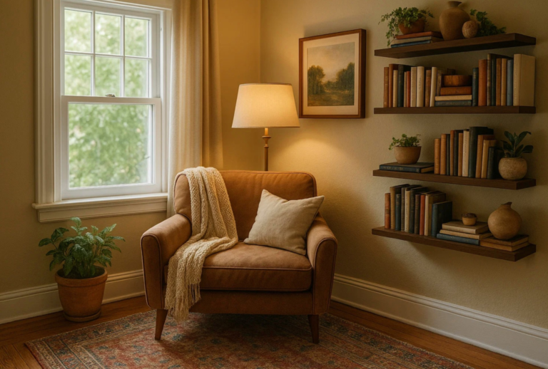 This cozy reading nook is the definition of calm and comfort. A caramel-toned armchair sits nestled between a window and softly glowing floor lamp, draped with a chunky knit throw and accented by a simple pillow. Floating wooden shelves display a curated collection of vintage books and natural-toned pottery, while a potted plant by the window adds a gentle pop of green. The overall palette—warm neutrals, soft lighting, and natural textures—invites you to sit, unwind, and linger a while.