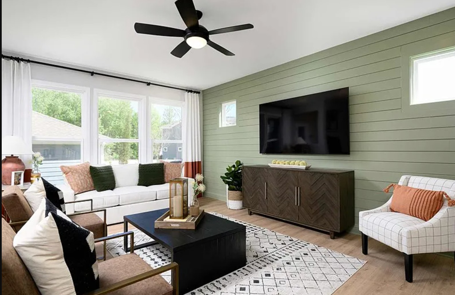 This living room strikes the perfect balance between comfort and sophistication—it’s the kind of space that feels both beautifully curated and entirely livable. Soft natural light floods in through the oversized windows, instantly lifting the mood and drawing attention to the calming sage green shiplap wall that serves as a subtle focal point. The color palette is warm yet grounded, with earthy greens, soft terracottas, and textured neutrals that invite you to settle in and stay a while.